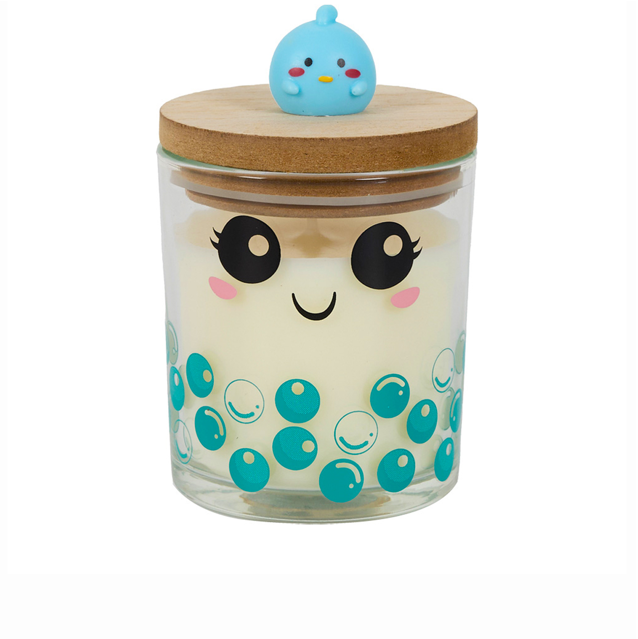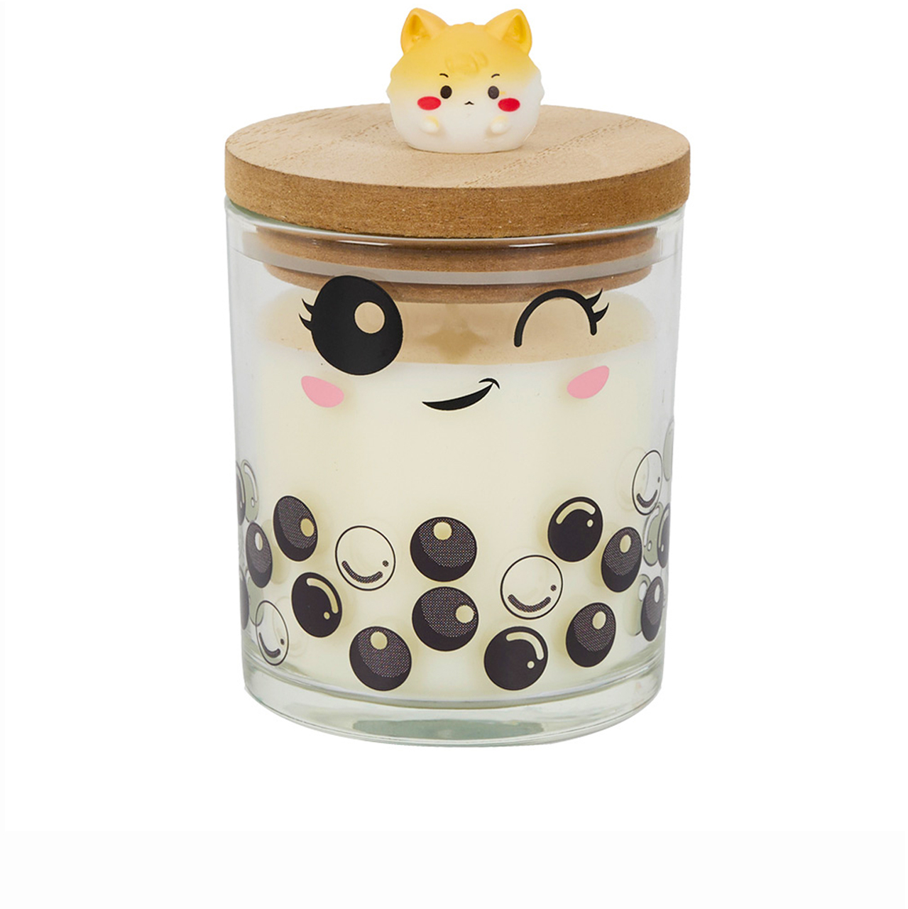 Candle in glass cup with wooden lid.