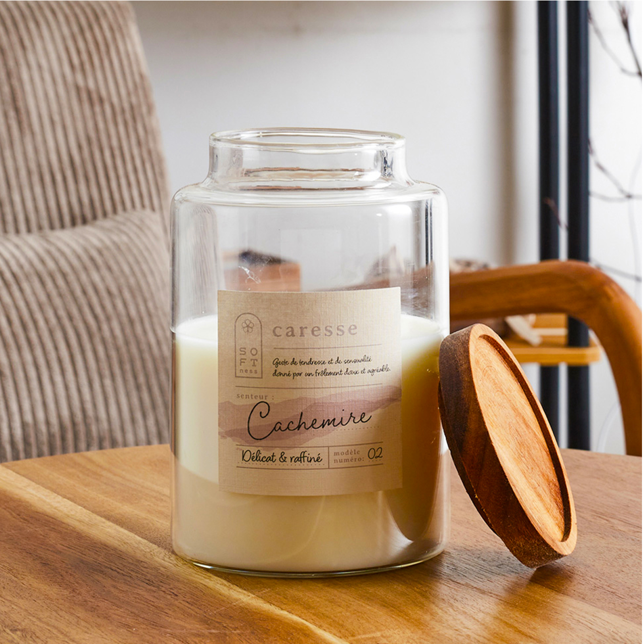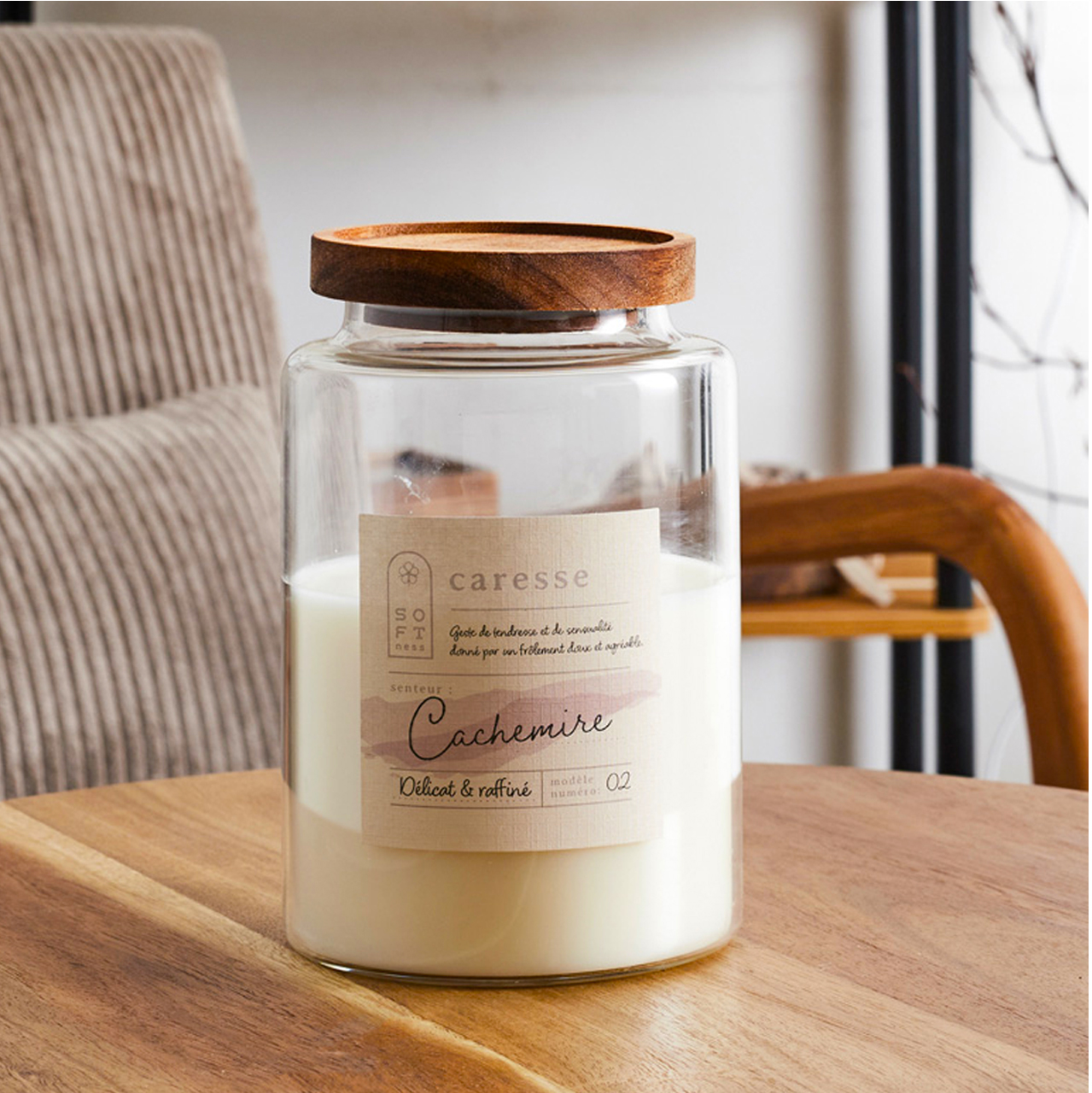Candle in a glass jar with acacia wood lid.
