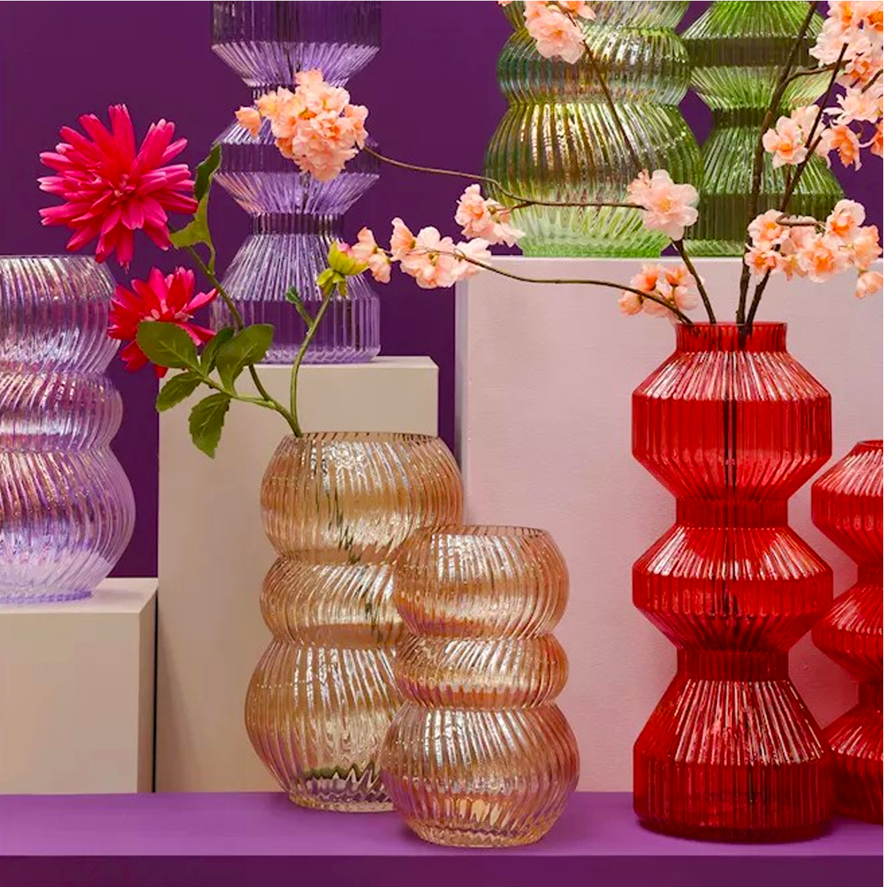 Red glass vase with a unique, embossed shape. Ideal for flowers or as a decorative element with character.