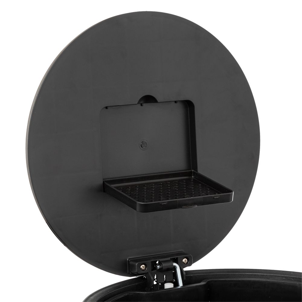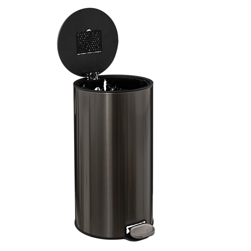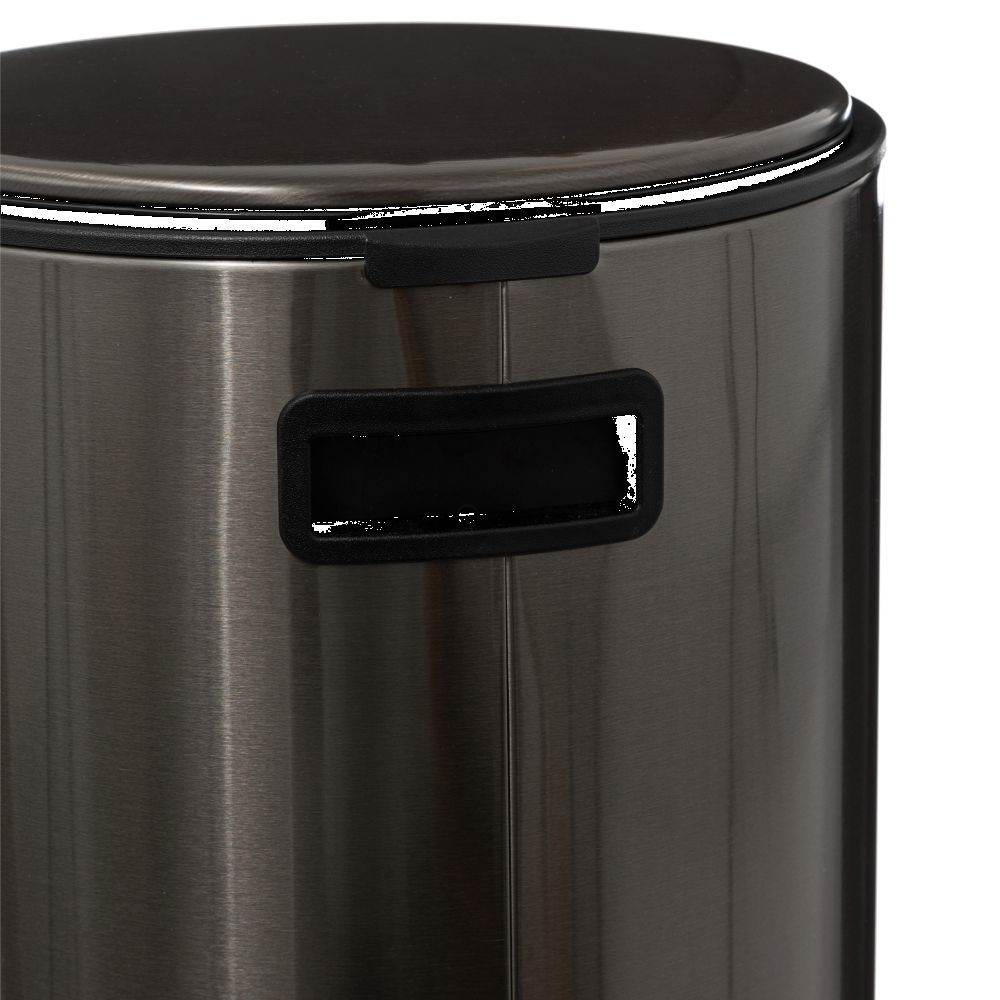 Round metal waste bin, 30L capacity. Equipped with the soft close function for soft and silent closing of the lid. The included active carbon filter neutralizes bad odors. Easy cleaning thanks to the removable bucket and the suspension system for the waste bag. Super flat cover, wont damage your walls and stays open at 90°. Compact reinforced metal pedal for greater comfort of use.