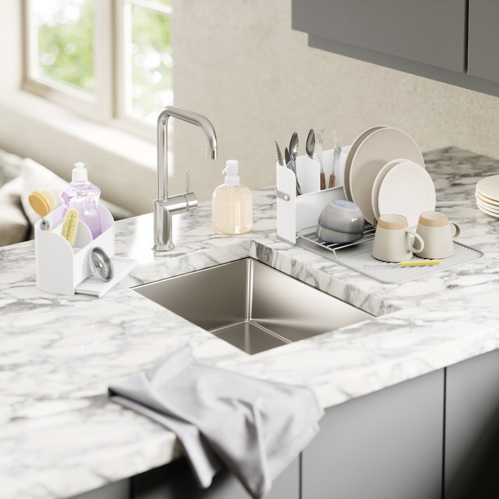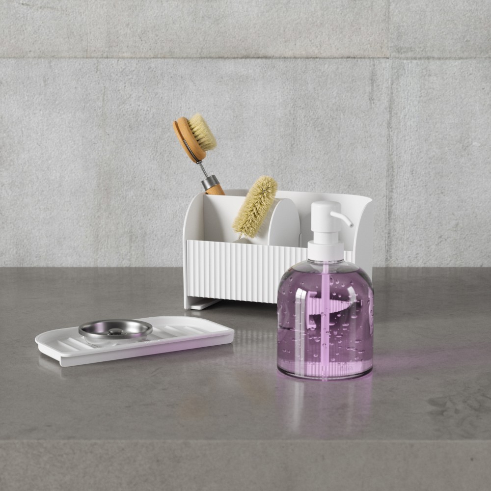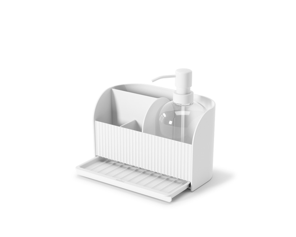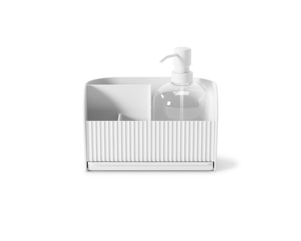 White kitchen organizer and dispenser, measuring 17x21x18 cm, made from high-quality plastic. This practical organizer is perfect for keeping your kitchen essentials neat and easily accessible. With its sleek design, it can hold various utensils such as spatulas, ladles, and other small items, providing an organized and functional solution for your kitchen. Lightweight and durable, it is ideal for everyday use.