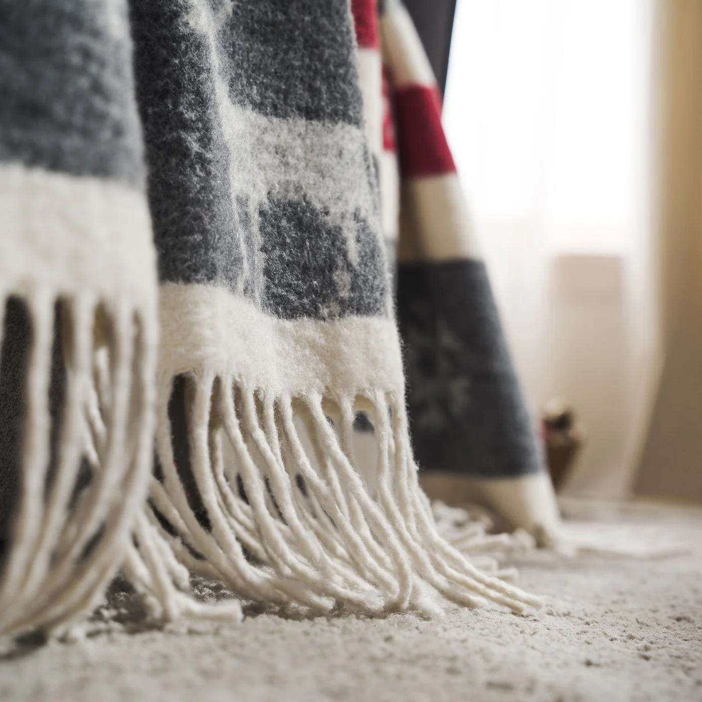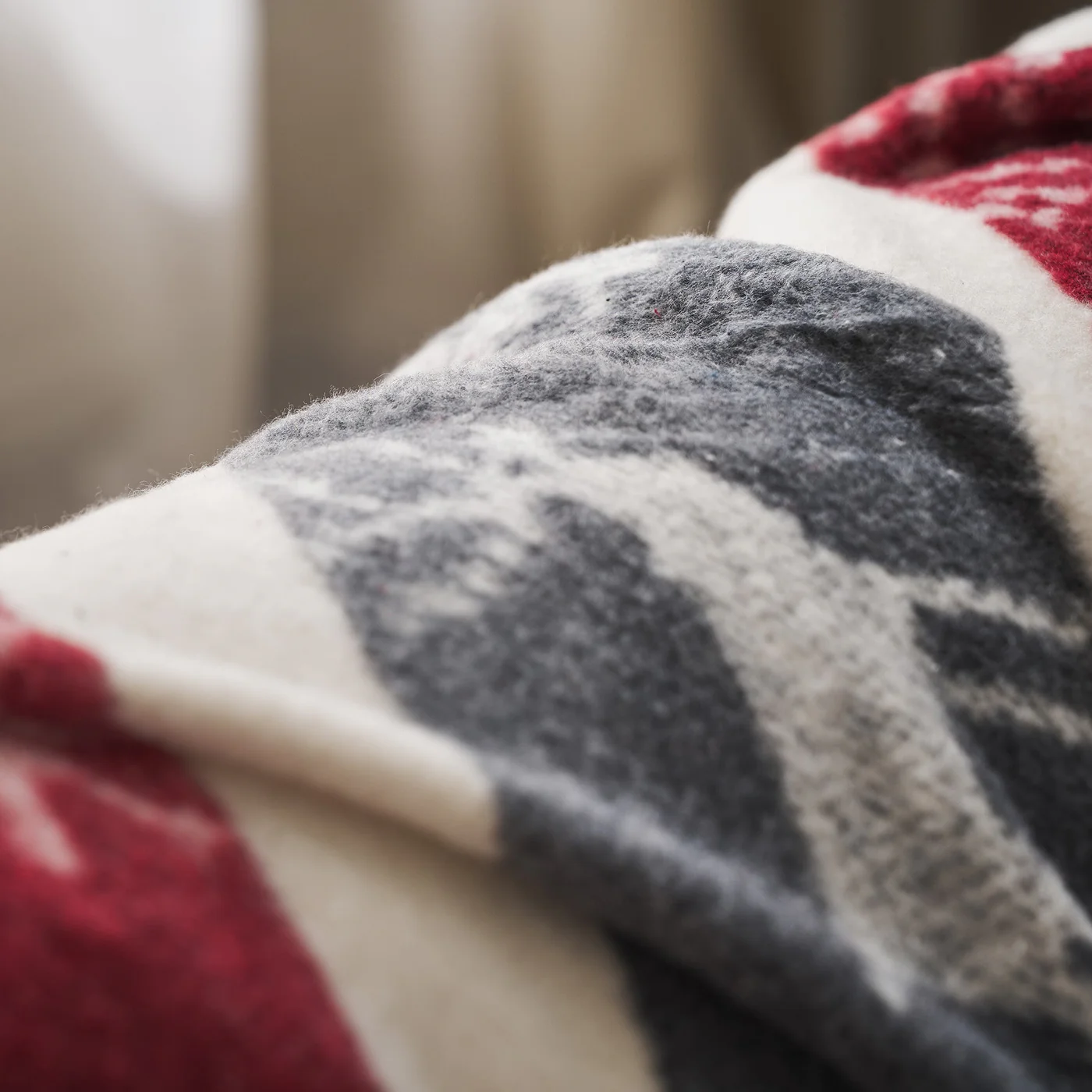 The Fianna throw blanket, measuring 130x170cm, features a Christmas design in red and grey. Made from fluffy, soft fabric with a composition of 80% cotton and 20% polyester, it adds warmth and style to your sofa or living room. The fringe detail at the edges enhances its elegant look. Machine washable at 30 degrees and tumble dried on a low spin cycle.