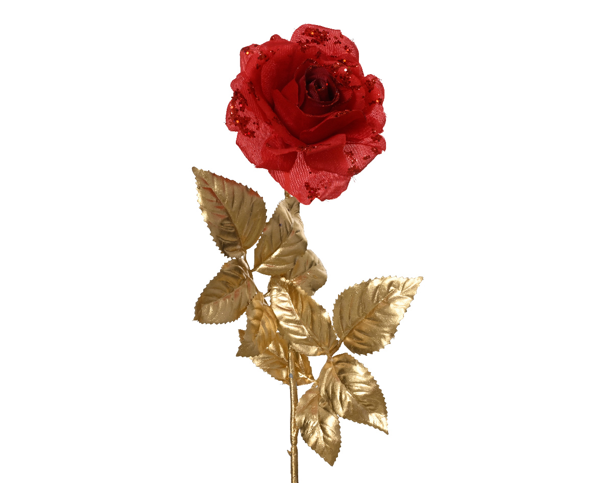 Χριστουγεννιάτικο διακοσμητικό τεχνητό λουλούδι βελούδινο τριαντάφυλλο με χρυσά φύλλα 10x10x72cm